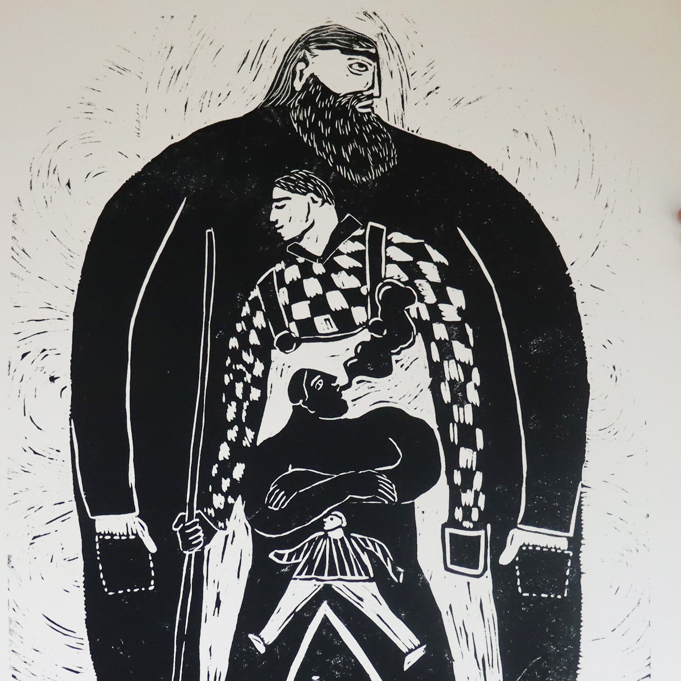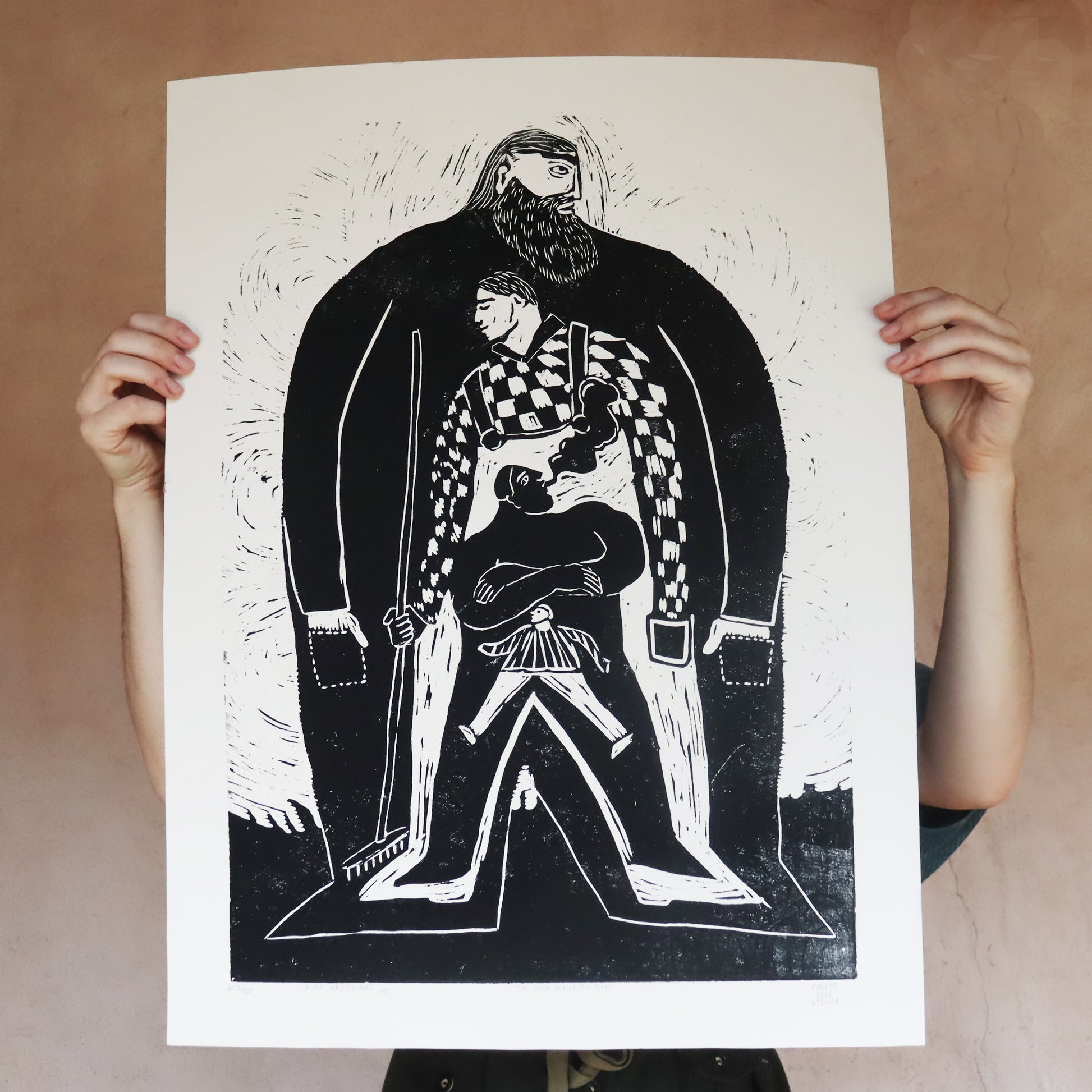 A psychological landscape carved into wood—a giant figure spans the entire surface, containing within itself layer upon layer of other selves. From the sturdy giant to the gentle boy, from the rebellious smoking teenager to the innocent child, each persona exists simultaneously within one being. This print explores the complexity of identity, the multiple selves we carry, and the internal cast of characters that shape who we are.