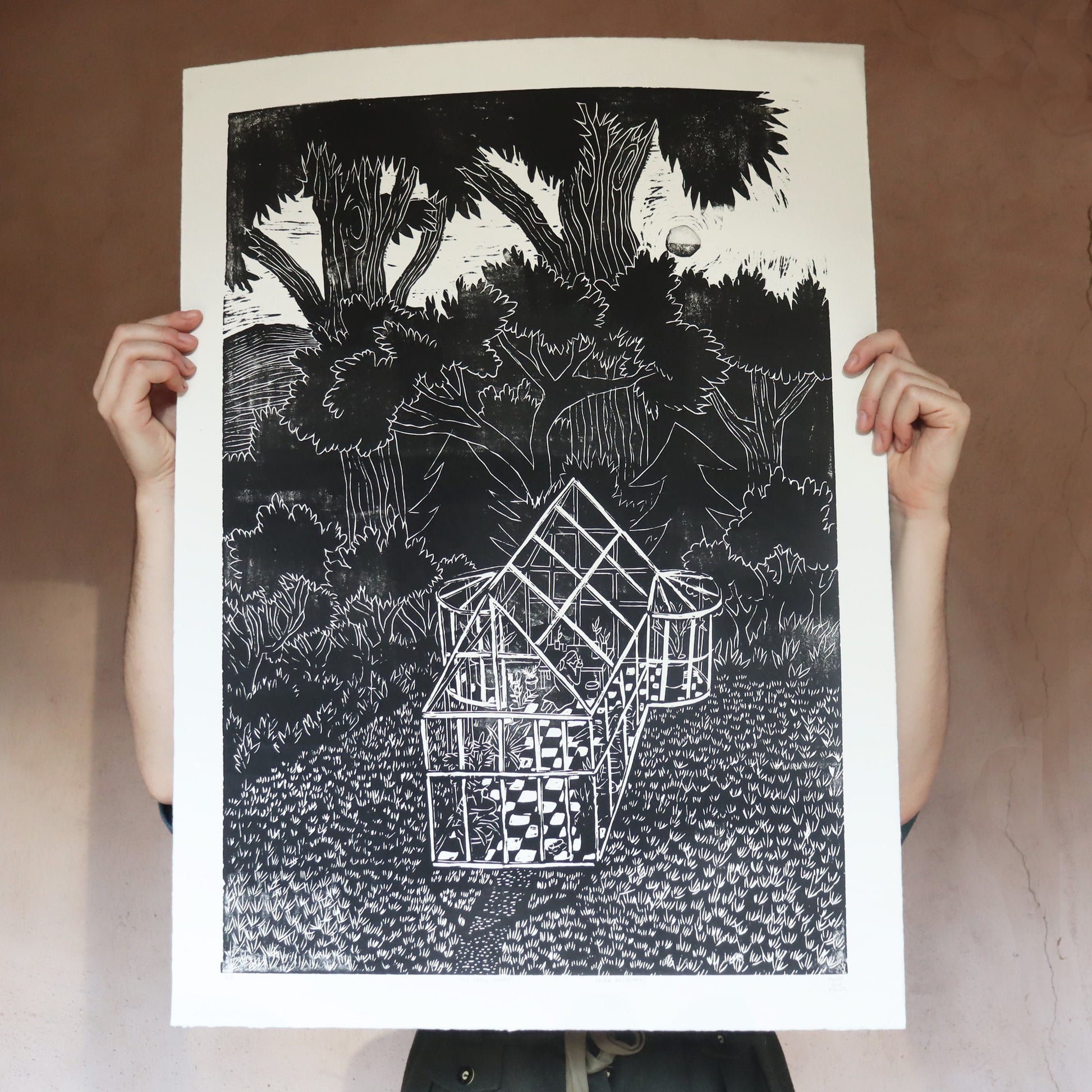 A place of quiet devotion—a greenhouse rises in the form of a chapel on a gentle hillside, its sacred architecture dedicated not to prayer but to the patient work of potting up seedlings. Inside, a solitary figure tends to new life while beyond the glass walls, the forest edge marks the boundary between cultivation and wild. This serene scene suggests that tending plants is its own form of worship, that greenhouses can be sanctuaries, and that the act of nurturing growth is a spiritual practice.