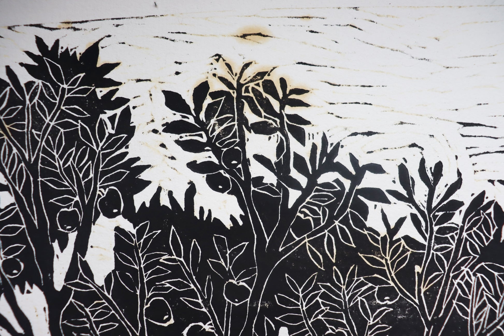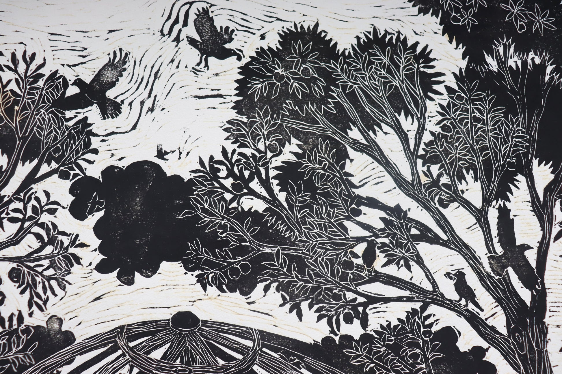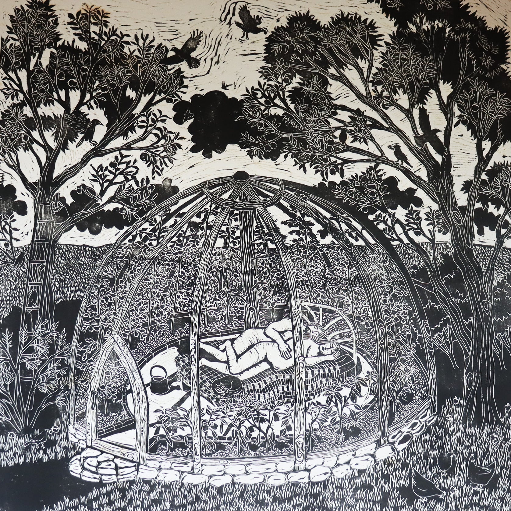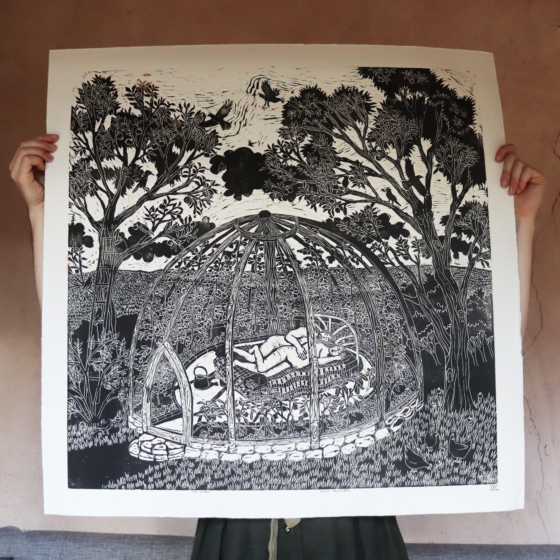 Part of the Studio Clearance collection, this is a test print from the original edition. It includes some linseed oil marks and features extra carved elements not present in the final series—offering a unique glimpse into the evolution of the design. This large square format print captures the sensual joy of building a life together, where bodies and gardens both bear fruit in their season.